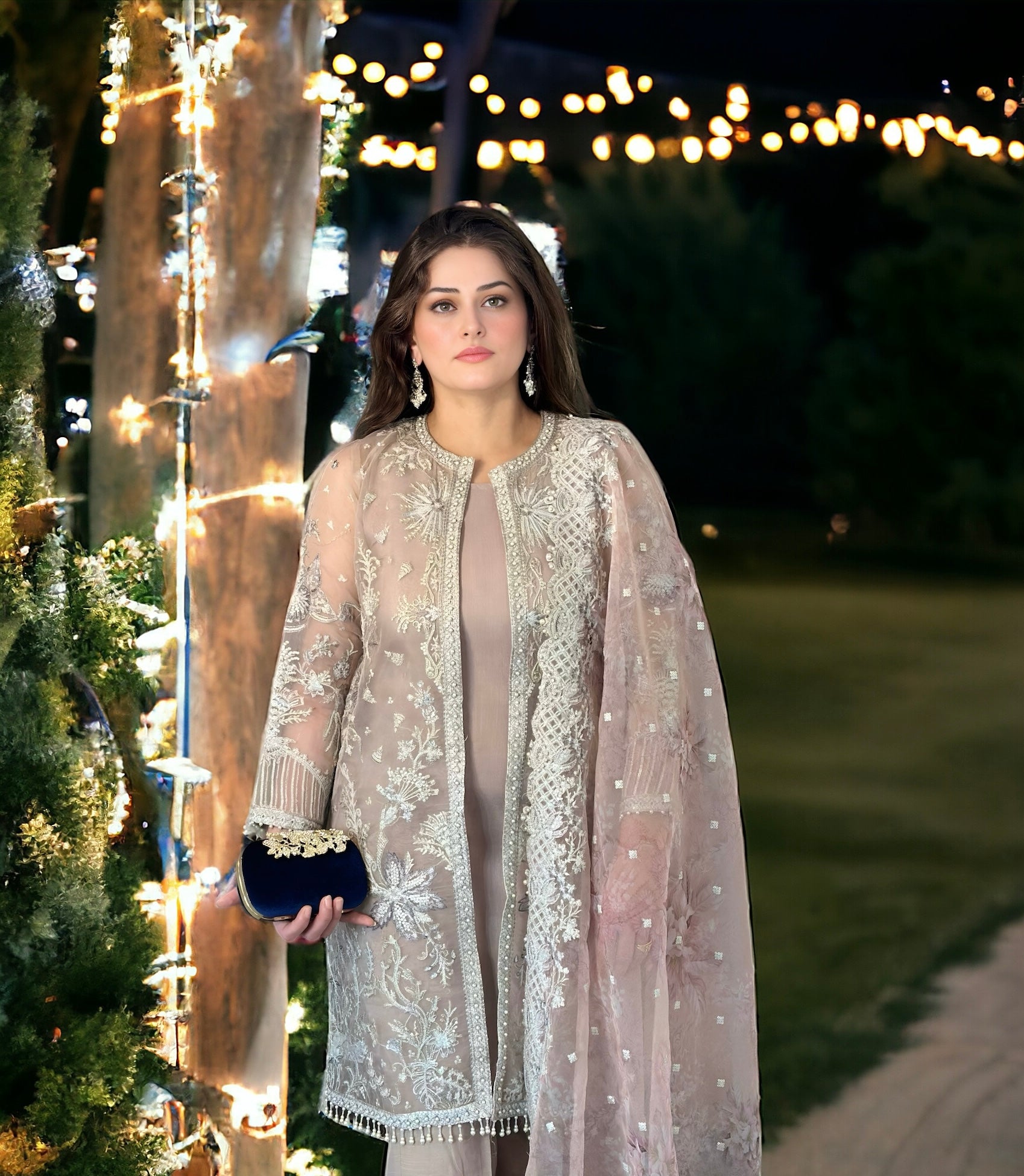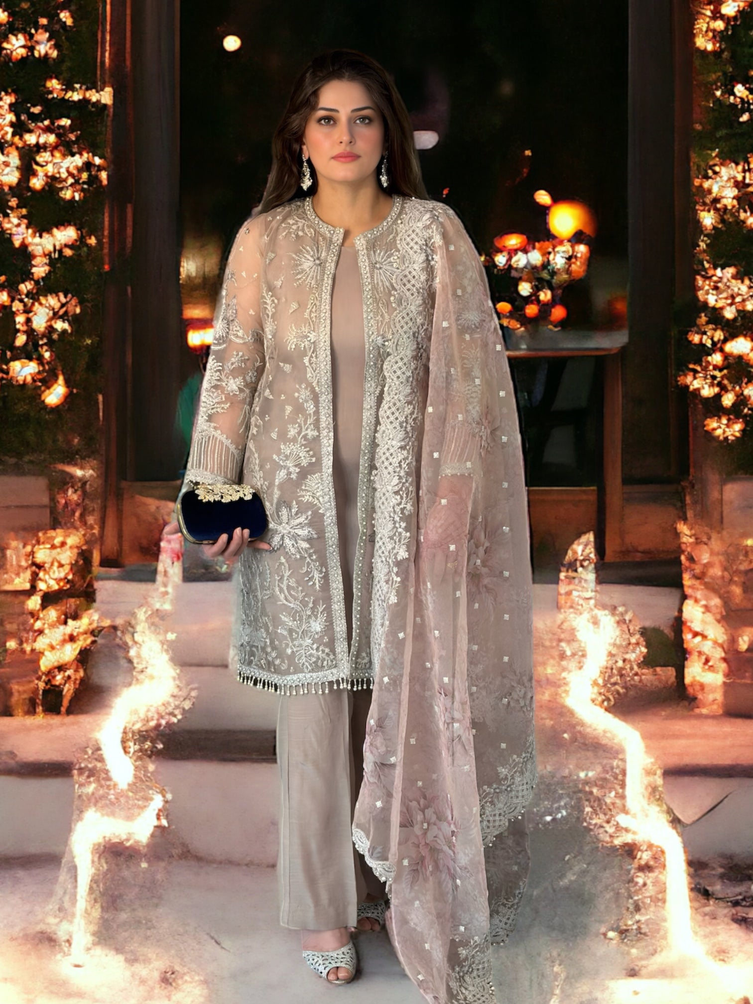 Elegant Ensemble: Tissue Three-Piece Suit with Open Gown